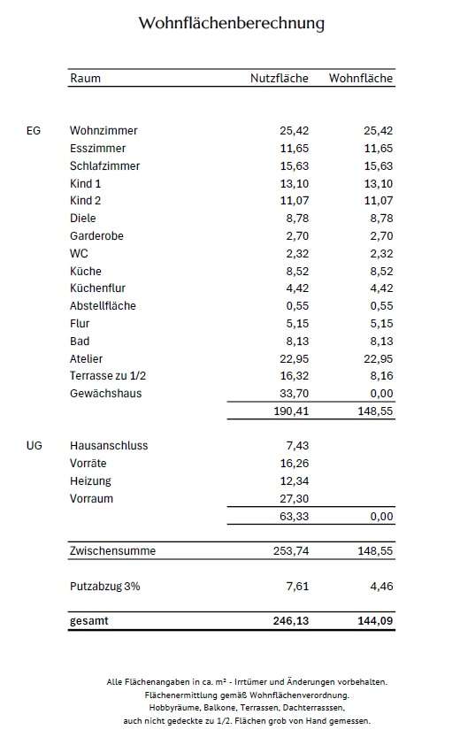 Insbesondere der Grundriss weicht eventuell in Details von der ursprünglichen Planung ab. Die Flächen wurden aus dem Grundriss lediglich grob herausgemessen. Bitte haben Sie Verständnis, das das Flächenmaß daher nur als grobe Schätzung betrachtet werden kann. Jegliche Haftung hierfür wird daher ausdrücklich ausgeschlossen. Wir empfehlen bei Zweifeln vor dem Kauf selbst ein Aufmaß vorzunehmen.